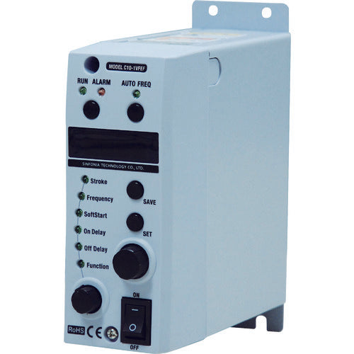カタログ品番:C10-1VF 特長:●設定値管理が簡単なデジタル設定・表示です。●豊富な外部コントロール機能を備えています。●CEマーキング適合品です。●キーロック機能付です。 用途:●パーツフィーダ、リニアフィーダ専用コントローラとして。 仕様:●適合機種:ER-25B、EA-15B、20B、LFB-300、400、550、LFG-600、750、900●幅(mm):59●奥行(mm):141●高さ(mm):160●最大電流(A):1.0●チューニング:手動●入力電源:AC100〜120V±10%、AC200〜230V±10%、50/60Hz●制御方式:PWM方式●出力電圧:0〜190V(入力AC200V系)、0〜95V(入力AV100V系)●出力振動数:半波45〜90Hz 全波90〜180Hz 中間波65〜120Hz 高周波180〜360Hz●速度切替:外部信号により振幅設定値切替が可能(最大4設定)●運転・停止制御:外部信号により運転/停止が可能、接点のNPNとPNPをスイッチで切替可能●出力信号:運転に同期した信号を出力●ソフトスタート:立ち上がり時間0.2〜4.0秒 注意:●圧電式振動体には使用できません。