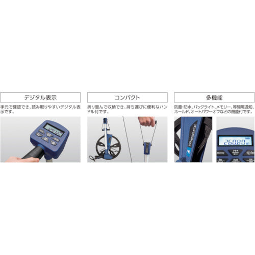 カタログ品番:75419 特長:●車輪が大きいため安定した測定ができます。●アナログタイプよりも読み取りやすい、バックライト機能付の大型・大文字・手元ディスプレイです。●メモリー機能で測定値を100件まで保存可能です。●測定値をホールドし、液晶の見えにくい状況でも数値が確認できます。●設定した距離毎に音で知らせる等間隔通知機能付です。●持ち運びしやすく、コンパクトに収納できる、折り畳み式です。●防塵・防水性能IP54です。●オートパワーオフ機能付です。●滑りにくく握りやすいハンドルです。●収納ケースとストラップ付です。 仕様:●測定範囲:-99,999〜99,999m●縮長〜全長(mm):510〜980●車輪径 32cm●測定範囲 -99999〜99999m●許容差 0〜10m:±0.05m、10m以上:±0.5%●最小表示 1km未満:0.01m、1km以上10km未満:0.1m10km以上:1m●表示単位 m●カウント検出方式 磁力センサー●メモリー機能 100件●等間隔通知 設定可能範囲:0.01〜9999.99m●使用温湿度 -10〜60℃、95%以下●防塵・防水性能 IP54※(折り畳み部、電池ケース内部を除く)※防塵性能:粉塵が内部に侵入することを防止します。