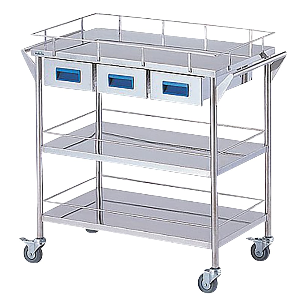 引出し付きで小物の収納に便利です。 φ75mmキャスターの採用や両面ハンドルの標準装備により、操作性に優れています。 天板及び中棚には共に転落防止用の枠付きです。 引き出し付きで小物の収納に便利です。材質:ステンレス(SUS304) キャスター:φ75mmウレタン製(対角ストッパー付き) 引出数:3個 引出し内寸法:170×350×90mm 棚間隔:(上下段)225mm 棚板耐荷重:15kg 引出取手色:ブルー 足パイプ径:φ25mm 幅×奥行×高さ(mm):750×450×840 重量(kg):22