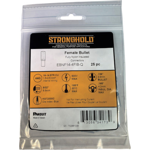 ストロングホールド ナイロン完全絶縁被覆付メス型ギボシ端子 電線サイズ:AWG16〜14/1.25〜2sq 端子幅3.9mm用 25個入り EBNF14−4FIB−Q EBNF14-4FIB-Q 1 袋