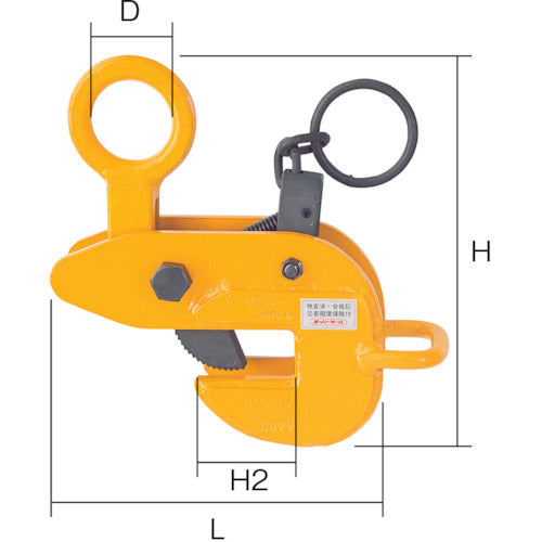 カタログ品番:HLC2U 特長:●構造用形鋼や平鋼板の横(水平)吊りクランプ(形鋼の長手方向2点吊り)に最適タイプです。●スプリング式締め付けロック機構で、無負荷状態でも、クランプは確実にグリップします。●S・M・A・Я・T管理アプリに対応し、無料で登録できます。 用途:●構造用形鋼(H形、I形、L形鋼など)や平鋼板の横吊り作業。 仕様:●基本使用荷重(t):2.0●クランプ範囲(mm):0〜35●寸法(mm)D:60●寸法(mm)H:292●寸法(mm)H2:74●寸法(mm)L:241●高さ(mm):292●幅(mm):241●ロックハンドル機構付●下あご先割れ(2分割)タイプ●ワークの取り外しが容易な取手付●2点・4点吊り用(平鋼板の横吊りが平行な場合) 注意:●指定容量以上では使用しないでください。●必ず2台以上でご使用ください。