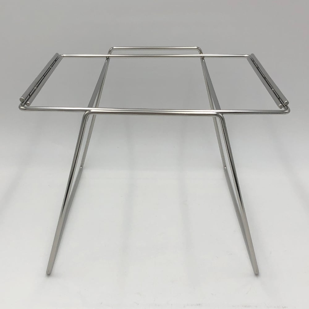 天板固定棚に落下防止用の枠付きで、未使用時はスタックして収納が可能です。型番:260角用台