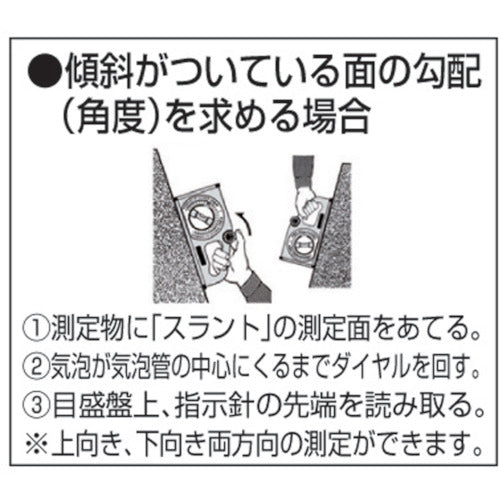 カタログ品番:SLT-100 特長:●勾配(角度)測定・勾配(角度)設定、2通りの使い方ができます。●法勾配および角度対照表付です。 用途:●擁壁の施工護岸工事などでの法面の測定に。●土木・建築工事用勾配計 仕様:●長さ(mm):250●高さ(mm):125●厚さ(mm):25●最小読取値:2°●精度:±1.25mm/1m=0.072°以内●測定範囲:130°〜0°〜130°●目盛仕様:内側2度通し、外側1分〜8分(0.5分目盛通し)(注)1分=1/10割、1割、1.2割、1.5割、1.8割、2割●マグネット:なし●タイプ:高精度アルミ底面●気泡管:水平・垂直●エラストマー製サイドプロテクター付●蓄光シート●法勾配及び角度対照表付 材質/仕上:●本体:ABS樹脂●気泡管:アクリル