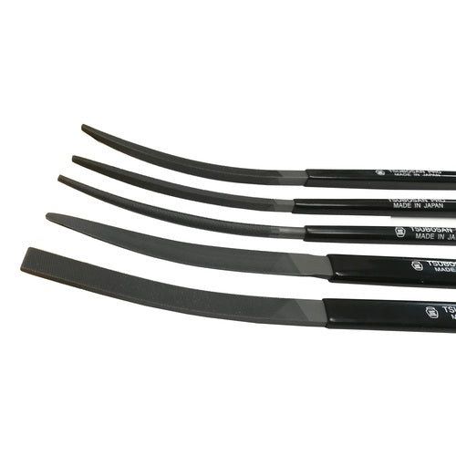 カタログ品番:STS05-02 特長:●ヤスリ形状が舟の底の様に曲がっており、ワークにあった作業が出来ます。●プロの職人さんのためのヤスリです。 用途:●鉄をはじめ、あらゆる金属の加工に。●なめらかな曲面仕上げが必要とされる箇所の切削に。 仕様:●タイプ:中目●全長(mm):215●刃長(mm):110●形状:5種セット 材質/仕上:●合金工具鋼(SKS-8) セット内容/付属品:●平・半丸・丸・角・三角 (各1本) 注意:●プロヤスリは全種1s5本入りです。●5本組はサイズを表します。 5本組=215mm(全長)