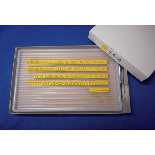 カタログ品番:KJ-SA-04 特長:●フラットスタンプ/ロールマーカーで使用する差替え式ゴム活字です。●印面の裏側が凸面仕様になっていて、印字内容を自由に設定できます。 仕様:●文字サイズ(mm):4●足数(本):2●Sタイプ(英字セット) 材質/仕上:●ゴム(黄) 注意:●本体のリブベース寸法、足数とゴム印の足数をご確認ください。