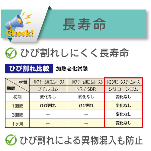 カタログ品番:TSISTM-12-5 特長:●流体はスチーム(蒸気)と高温水です。●従来のスチームホースの重量が1/2で軽く柔らかく、ひび割れしにくく長期間使用できます。●低臭でゴム臭もなく、不快感が軽減できます。●【長持ちスチームホース】長期間使用しても、ホース表面がひび割れしにくく、ホース破片による異物混入を防止します。●【低臭スチームホース】 シリコーンゴム製で臭いが少なく、製品への臭い移りを防止します。●【法適合】 食品衛生法、RoHS2適合で安心です。 用途:●スチーム・高温水用(スチームドレン、スチーム洗浄、耐熱高温水配管用)。 仕様:●長さ(m):5●内径(mm):12.7●外径(mm):19.5●使用圧力(MPa):0〜0.3(スチーム 〜140℃)、0〜0.5(高温水 〜140℃)●許容曲げ半径(mm以上):130●使用温度範囲:-30〜140℃●平成24年厚生労働省告示第595号適合●FDA DMF Type[[R2]] No.25486登録●色:グレー/グリーンライン入り 材質/仕上:●主材質:シリコーンゴム●補強材:ポリエステル糸 注意:●使用流体はスチーム・高温水です。食品や薬品洗浄用途には使用しないでください。また、70℃以上の動・植物油には絶対に使用しないでください。●スチーム(飽和水蒸気〜140℃、〜0.3MPa)は、ホース片側解放で断続使用が原則です。固定配管(両端接続)では絶対に使用しないでください。ホースの寿命が短くなります。●シリコーンゴムはガス透過性が高い性質を持っています。気体を使用される場合はご注意下さい。●安全面での配慮が必要な用途については、ご使用者様にて事前にご確認ください。体内に埋植、注入する用途、或いは体内に一部が残留する恐れがある用途には使用しないでください。●使用温度範囲内、使用圧力範囲内でご使用ください。※負圧用途には使用しないでください。変形して使用できなくなる場合があります。