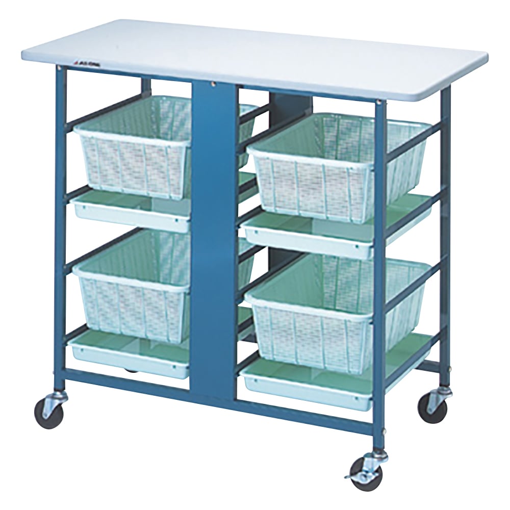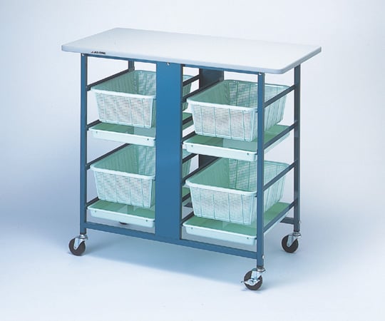 洗浄したガラス器具の運搬・保管に便利です。 移動式作業台の利便性に収納機能をプラスしました。 天板は軟質PVC(塩化ビニル樹脂)のソフトエッジ加工を施しています。材質:天板/木製合板ソフトエッジ加工(表面抗菌性化粧合板)、支柱/スチールパイプ(メラミン焼付塗装) バスケットサイズ:390×294×135mm キャスター:φ65mm(ストッパー×2個付き) 天板耐荷重:約20kg 付属品:バスケット・水受トレー×各4個 サイズ(mm):900×450×800 重量(kg):16
