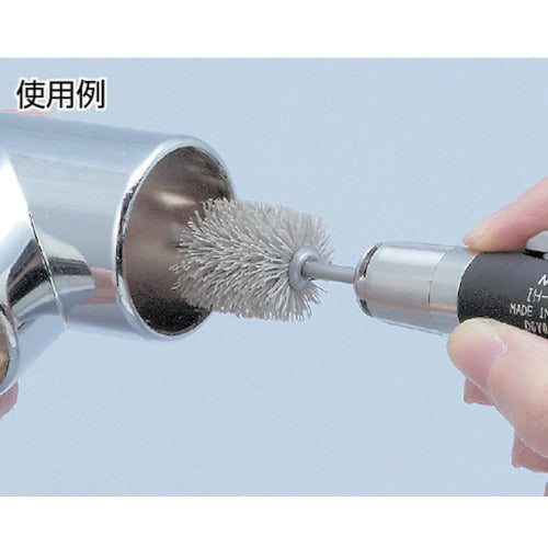 カタログ品番:51628 特長:●ステンレス線を芯線により、スパイラル状に固定しています。●全長が長く(100mm)、通常のブラシでは対応できない奥行を加工できます。 用途:●円筒内面、ねじ穴、パイプ内面、交差穴、曲面のバリ取りに最適。●金属、非鉄金属、プラスチック、ゴム等、各種材質への加工ができます。 仕様:●線径(mm):0.1●毛材:ステンレス●外径(mm):12●ブラシ部長さ(mm):30●軸径(mm):3●適合内径(mm):12●全長(mm):100●最高使用回転数(rpm):3000●入数:1本 材質/仕上:●軸芯:ステンレス(SUS304)●軸周り:真鍮(C3604B) 注意:●安全のため、保護メガネなど、保護具を必ず着用してください。●最高使用回転速度以下で使用してください。●ご使用に際しては、必ず回転調整付きの精密電動工具をご使用ください。エアーツールは使用不可です。●回転方向は、必ず正転(右回転)にてご使用ください。●作業開始に際しては、ツールを加工する穴や内面に挿入してから電動工具を始動してください。