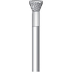 カタログ品番:11404 特長:●微細で精密な研削加工に最適です。●電着ボンドは研削砥粒の突き出し量が大きく、集中度も高いため研削力に優れています。●厳選されたダイヤモンド砥粒を使用し、最新の電着技術により強固に砥粒を保持していますので耐久性も優れています。●切れ味が良いので乾式切削でも切削焼けや熱による歪みを最小限に抑えることができます。 用途:●超硬合金、セラミックス、石材、ガラス、シリコン、FRP、フェライト等硬くて脆い材料の加工。 仕様:●粒度(#):130●刃径(mm):4.7●刃長(mm):2.8●軸径(mm):2.34●全長(mm):45●形状:逆テーパー●最高使用回転数(rpm):50000●砥粒:ダイヤモンド●入数:1本 注意:●安全のため、保護メガネなど、保護具を必ず着用してください。●最高使用回転速度以下で使用してください。