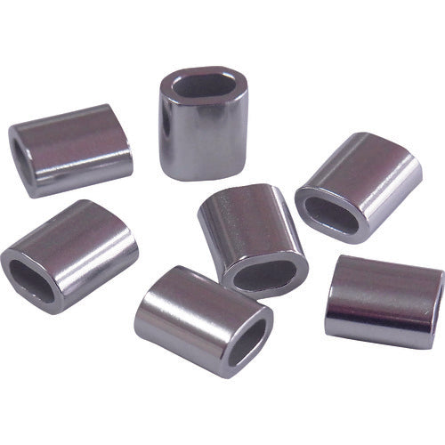 カタログ品番:AYP-25A 特長:●市販の電工ペンチ、圧着工具でカシめる金具です。 用途:●ワイヤー先端のアイ加工部分。 仕様:●適合ワイヤ径(mm):2.5●専用圧着工具:無し(市販品で可)●アルミオーバルスリーブ(100個入) 材質/仕上:●アルミニウム(A-5052) 注意:●使用強度については使用する締付け工具によって使用荷重が変わるため、使用荷重は表記しておりません。