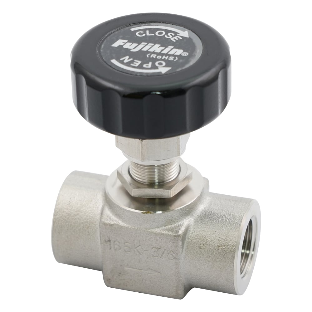 材質:本体/ステンレス(SUSF316)、 ステム/ステンレス(SUS316)、 グランドパッキン/ PTFE(四フッ化エチレン)、 ハンドル/アルミニウム