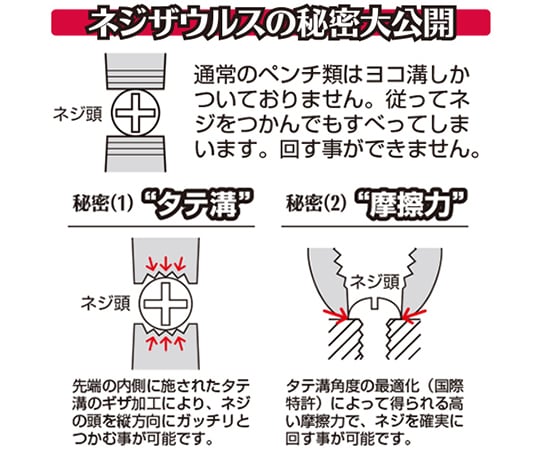 独自の先端形状により、頭の低いネジ(トラスネジ)にも対応。