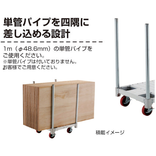 カタログ品番:NAC4-0765 特長:●耐久性に優れるシンプルな構造の軽量アルミ台車です。●荷崩れ防止用に単管パイプ(48.6mm)を四隅に差し込める差し込み口付です。●部材の交換・修理も可能です。●四隅にキャスターがはまる構造でスタッキング可能です。●アルミ製の軽量台車です。 仕様:●均等荷重(kg):1000●長さ(mm):740●幅(mm):640●高さ(mm):265●キャスター径(mm):150●タイプ:4輪仕様●完成品●ブレーキ付キャスター全輪自在式●イットン台車の小型タイプ●車輪:ウレタン●NTK6車輪:前後ブレーキ付・中央方向規制固定●4輪タイプ 材質/仕上:●本体:アルミ合金●車輪:ウレタン 注意:●単管パイプは付属しておりませんので、お客様にてご用意ください。