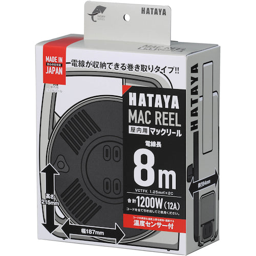 カタログ品番:MS-8-IV 特長:●手巻き式のコンパクトなコードリールです。●電線の溶解・焼損を防ぐ温度センサー付です。 用途:●事務所内、家庭用、DIYなどに。 仕様:●電線種:VCTFK●電線仕様長さ(m):8●電線仕様太さ([[MM2]]):1.25●電線仕様芯数(C):2●定格電流(A):5●コンセント仕様定格:2P・15A・125V●コンセント仕様形状:[[二相2]]●コンセント仕様個数:2●温度センサー:○●定格電圧(V):125●本体色:アイボリー●AC100V●電線仕様:VCTFK1.25mm2×2C●コンセント定格:2P・15A・125V●製品定格:125V・5A●温度センサー付●屋内用●電線長さ:8m●手巻式 材質/仕上:●本体:樹脂製 注意:●屋内使用