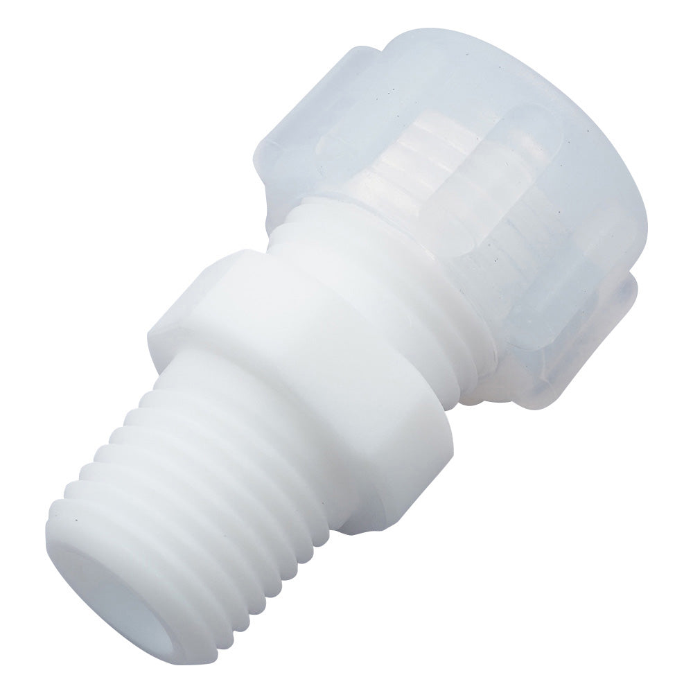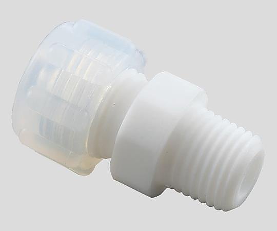 片側がチューブ接続で、もう一方はオネジ接続のストレート継手です。材質:本体/PTFE(四フッ化エチレン)、袋ナット/PFA(フッ素樹脂)