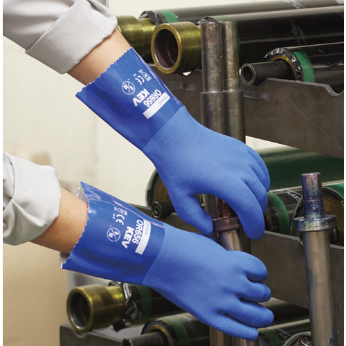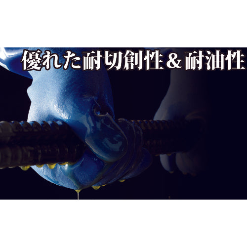 カタログ品番:OR656-9 特長:●塩化ビニールをコーティングしているため、天然ゴム製の手袋に比べて油に強く、耐摩耗性に優れています。●裏布にケブラー[[R下]]繊維を編みこんでいるため、切創のリスクを伴う作業から手を保護します。●独自の湾曲成型で手の動きを妨げず、手が疲れにくい手袋です。●指や手のひらにすべり止め加工を施していますので、グリップ力に優れています。 用途:●機械製造、自動車工業、鉄鋼。 仕様:●色:ブルー●サイズ:9/L●全長(cm):30.0●手のひら周り(cm):25.0●中指長さ(cm):8.1●厚さ(mm):約1.9●ゲージ数:13●EN388 2016規格:4X42B●耐切創レベル:X/B(EN388:2016) 材質/仕上:●表:塩化ビニール樹脂●裏:ケブラー[[R上]]繊維、綿、ポリウレタン