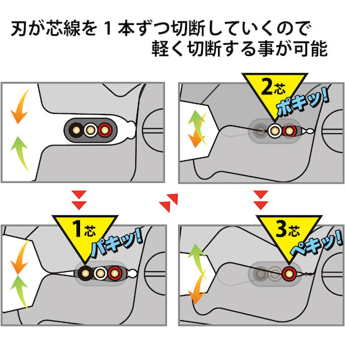 カタログ品番:6050-200 特長:●ケーブル切断刃:芯線を1本ずつ切断していく特殊形状の刃により、力が分散され1/3の力で切断可能です。●※弊社偏芯ペンチ比較※こちらの刃で硬線を切らないでください。●くわえ部:くわえ部がラウンドしているため、3点で部材をしっかり掴みます。●硬線切断刃:根本側の刃は高周波焼き入れを施すことで、ピアノ線などの硬線の切断が可能です。●新締結方式:10万回開閉してもガタつきが少ない新締結方式を採用しました。●刃の摩耗が少なく高耐久です。●グリップ形状:グリップにくびれを付けることで、片手でも力が入りやすく握りやすい設計です。●製造時の使用電力の20%を太陽光発電で賄っています。 用途:●VA/VVFの切断、鉄線、ピアノ線の切断に。 仕様:●全長(mm):209●切断能力(mm)鉄線:φ2.0●切断能力(mm)VA線(VVF):Φ2.6×3芯●切断能力(mm)ピアノ線:Φ0.8●落下防止用ひも取付穴:無●ハンドル:樹脂●樹脂グリップ付●切断能力(mm)IV線:22平方ミリメートル 材質/仕上:●特殊鋼 注意:●電気の流れている物への切断は絶対にしないでください。●感電の恐れがあります。●本来の目的以外では使用しないでください。●作業時は周りの安全を確かめてご使用ください。●保護メガネ等を着用して作業してください。