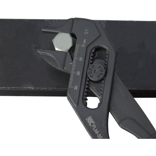 カタログ品番:FLM-35-BG 特長:●掴み面が平行に動き、力を掛けて挟み込む構造なので微調整が不要になりました。●ガタが少なくボルトやナットに傷を付ける心配がありません。●テコの原理でガッチリ掴むことが可能です。 用途:●番線、鉄線、ピアノ線の切断作業に最適です。●水道管、ガス管等への継手の取り付け・取り外しに最適です。 仕様:●最大口開き(mm):35●全長(mm):183●先端厚さ(mm):6.2●色:黒金●グリップ有無:有 材質/仕上:●特殊鋼