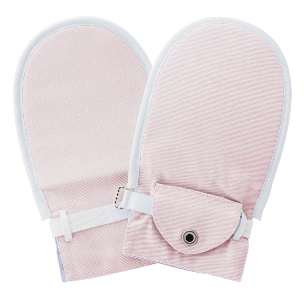 交換可能なアイデアホック付きベルトカバーです。 手袋の内部はゆったりとした設計で余裕があり、手指の動きを妨げません。 面ファスナー(マジック式)により調整可能な手首ベルトです。 手首ベルトをカバーで覆い取り外しにくくした設計です。色:ピンク サイズ:M 入数:1双(2枚入) 材質:表地/綿100%(綾織り)、裏地/ポリエステル65%・綿35%(平織り)、縁取りテープ・ベルト/ポリエステル100%、面ファスナー/ナイロン100%、ホック/医療用ステンレス 左右兼用 適応手首周囲:120~180mm 適応手の長さ:140~180mm