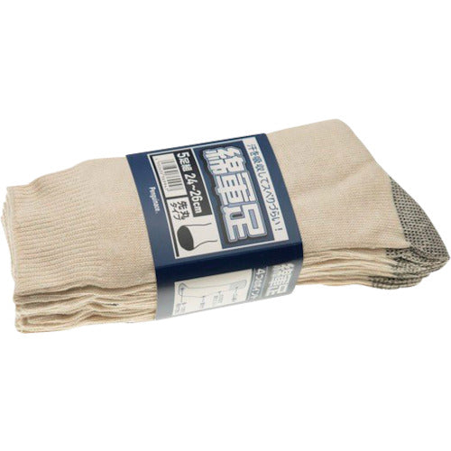 カタログ品番:GUNSOKU-SAKIMARU-5P 特長:●汗を吸収して滑りづらいです。●吸汗性に優れ快適な履き心地です。 用途:●作業用。 仕様:●色:アイボリー/ブラック●タイプ:先丸●サイズ(cm):24.0〜26.0●ゲージ数:0.5●全長(cm):15.0●履き口ゴム編み、のびのび蒸れにくい。●踵付き、踵・つま先黒糸で強化。 材質/仕上:●綿・アクリル・レーヨン