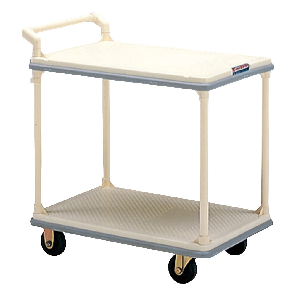 軽量性と清潔性を特に重視した設計です。 衛生的で軽量の台車“ポリトラー”。サイズ(mm):735×475×810 重量(kg):12 荷台サイズ:735×475mm キャスター:φ100mm(ストッパー無し) 積載重量:100kg 上下段間有効高さ:507mm 荷台高さ:160mm/715mm 押手高さ:810mm ※キャスターストッパー付きもございます。お問い合わせください。