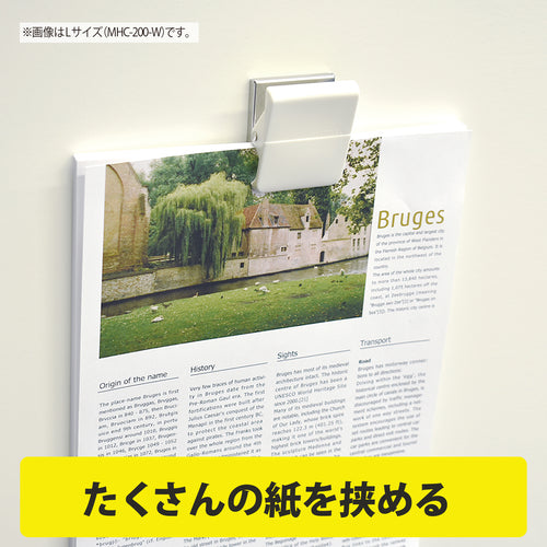 カタログ品番:MHC-150-W 特長:●裏面に高機能すべり止めを使用、ズレ落ちや落下を防ぎます。●サビに強く耐久性に優れた素材を使用しているので、屋外や水回りで使用できます。●らくバネ機構により従来品より約40%の力で開きます。 用途:●オフィスや屋外の掲示物に。 仕様:●色:白●縦(mm):44●横(mm):40●保持枚数(枚):150●マグネット式●A4用紙保持枚数 150枚 材質/仕上:●本体:ポリカーボネート・ステンレス・シリコン・滑り止めゴム 磁石:フェライト磁石
