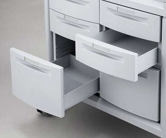 天板・棚板は枠付きですので、小物類の落下を防止します。引出数:浅型4個・深型2個