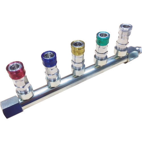 カタログ品番:6PAL5-20-5 特長:●配管から直接5分岐の空気取出口を実現できます。●手間のかかるエアー配管工事が簡単にできます。●業界初のカラーカップリングを採用しています。●配管ラインの色分けが可能です。●従来品より軽量です。 用途:●エアー配管から直接、取り出し口を分岐出来ます。 仕様:●最高使用圧力(MPa):1.5●分岐数:5●取入口:R3/4●使用温度範囲(℃):-20〜80●色:赤・青・黄・緑・銀●使用流体:空気 材質/仕上:●本体:鋼鉄●シールゴム:ニトリルゴム(NBR) 注意:●色付けは塗装ですので、使用状況において剥がれ等が生じます。