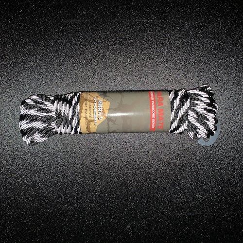 カタログ品番:PMHR-02 特長:●パラメイトロープの反射タイプです。●夜間、ライトの光に反射します。●アウトドア・キャンプでの使用やペットのリードやブレスレットを編んだりできます。 用途:●結束、アウトドア、装飾などに。 仕様:●色:黒●線径(mm):4●長さ(m):15●引張強度(kN):約2.45●包装形態:袋入 材質/仕上:●ナイロン、反射材(ガラスビーズ+PEP) 注意:●身体の確保・荷物の吊り下げなどの用途には使用できません。