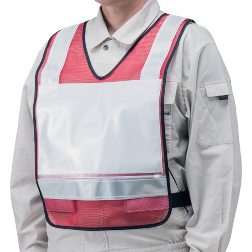 カタログ品番:831-831 特長:●反射テープ部は、高輝度反射材でよく目立ちます。●マジックテープとゴムバンドでサイズ調整可能です。●透明ポケットに職務表示を差し込んで表示できます。●市販のA4用紙を利用した差し込み式なので表示内容を簡単に変更できます。 用途:●建設現場や工場での職務表示、避難誘導の防災ベスト等に最適です。 仕様:●色:赤●着丈(cm):約55●胴周り(cm):約102-118●表示部:A4用紙差込タイプ●透明ポケット部内寸(mm):213×312●反射テープ色:白●バイアステープ色:黒 材質/仕上:●本体:ナイロンメッシュ●透明ポケット部:軟質ビニール●反射部:高輝度反射材●バイアステープ部:布 注意:●A4用紙はお客様にてご用意下さい。