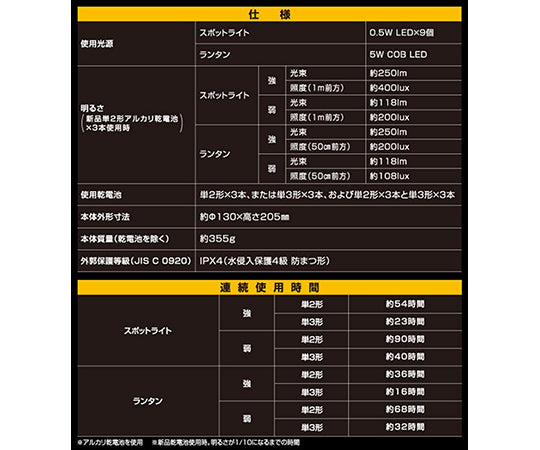 レジャーやアウトドアにもオススメ。用光源:前面ライト/0.5W LED×9個、ランタン/5W COB LED