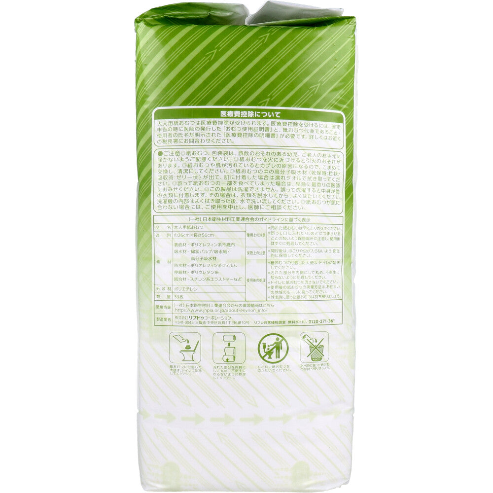 ずーっと弱酸性! 瞬間ドライ吸収。 瞬間吸収シートと拡散スリットのW採用で、尿をすばやく吸収! 一気に排尿しても、横向き寝でもモレずに安心。 さらに、尿の逆戻りを防ぐので表面はさらさら快適です。 ●しっかり立ち上がりソケイ部へフィット。 強力フィットギャザーでコツいらず!誰でも簡単にあてやすく横モレを防ぎます。 ●パッドの表面に弱酸性素材を採用。 パッドの表面をずーっと弱酸性に保つので長時間使用しても安心です。 ●ムレ軽減でお肌にやさしい。 ●からだの中心にあわせやすくパッドの向きがわかりやすいセンターライン。 【医療費控除対象品】 大人用紙おむつ 【適用サイズ】 巾26cm×長さ56cm 【素材】 表面材:ポリオレフィン系不織布 吸水材:綿状パルプ、吸水紙、高分子吸水材 防水材:ポリオレフィン系フィルム 伸縮材:ポリウレタン系 結合剤:スチレン系エラストマーなど 外装材:ポリエチレン 【使用後の処理】 ・紙おむつに付着した大便は、トイレに始末してください。 ・汚れた部分を内側にして丸め、不衛生にならないように処理してください。 ・トイレに紙おむつを流さないでください。 ・使用後の紙おむつの廃棄方法は、お住まいの地域のルールに従ってください。 ・外出時に使った紙おむつは持ち帰りましょう。 【あて方(テープ止めタイプと併用する場合)】 (1)体を横向きにしておむつをおきます。必ずテープのついている方を背中側にもってきます。 (2)「スピードキャッチパッド」のプリントがついている方をおむつ側にして、おむつの中央部におき、必ず立体ギャザーの内側に入れてください。 (3)体を戻しておむつの上にのせます。背骨の位置と、おむつの中心が合うようにしてください。 (4)股ぐり部分は立体ギャザーを足の付け根に沿わせ、すきまができないように体にぴったりとあてます。そのあと前部をひっぱり上げます。 (5)テープは股ぐり側を斜め上向きにつけ、次に腰まわり側を斜め下向きにつけてください。 (6)テープを付けたあとでウエストにぴったりしているか、股ぐりのギャザーが足の付け根に沿い、すきまがないかを確かめてください。 【使用上の注意】 ・紙おむつ、包装紙は、誤飲のおそれのある幼児、ご老人のお手元に届かないようご配慮ください。 ・紙おむつを火に近づけると引火のおそれがあります。 ・紙おむつや肌が汚れているとカブレの原因になるので、こまめに交換し、清潔にしてください。 ・紙おむつの中の高分子吸水剤(乾燥時:粒状/吸収時:ゼリー状)が出て、肌に付着した場合は濡れタオルで拭き取ってください。 ・誤って紙おむつの一部を食べてしまった場合は、早急に最寄りの医師におみせください。 ・この製品は洗濯できません。誤って洗濯すると中身が他の衣類に付着します。その場合は、衣類を脱水してから、よくはたいてください。洗濯機の内部はよく拭き取った後、水で洗い流してください。 ・紙おむつが肌に合わない場合には、ご使用を中止し、医師にご相談ください。 ・汚れた紙おむつは早くとりかえてください。 ・誤って口に入れたり、のどにつまらせることのないよう保管場所に注意し、使用後はすぐに処理してください。 【保管上の注意】 ・開封後は、ほこりや虫が入らないよう、衛生的に保管してください。