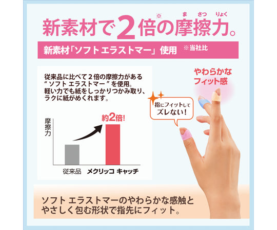新素材で2倍の摩擦力。当社の従来品に比べて2倍の摩擦力がある新素材"ソフト エラストマー"を使用。軽い力でも紙をしっかりつかみとり、ラクに紙がめくれます。
