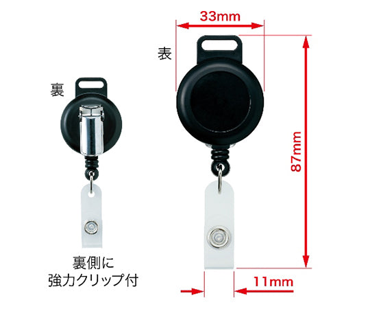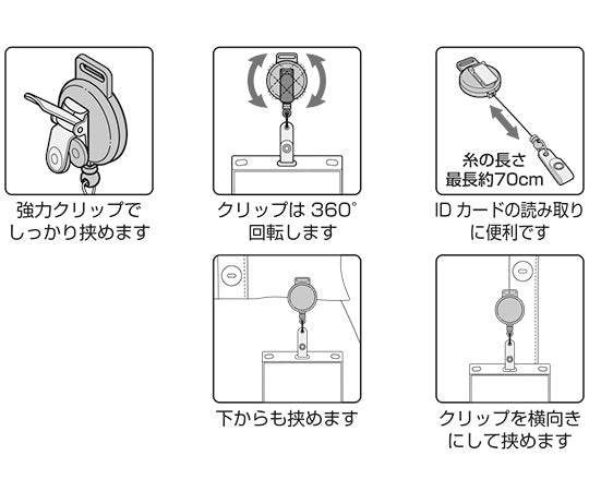 片手でカンタン操作、便利なリール式 裏面のクリップで、ポケットに固定ができます。 名札が裏返らず、常に正面を向きます。リールクリップのみ・ハトメ式 最大リール長:約700mm