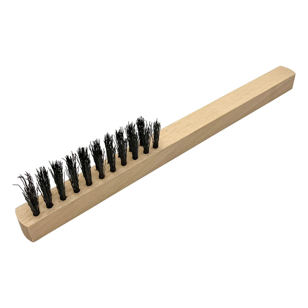 金属のサビ・汚れ落としや、塗装剥がし、研磨等に適しています。線径×毛丈:φ0.3×25mm 全長×幅×毛付(mm):255×18×90 直柄スタンダード型 ブラシ材質:硬鋼線(黒波)