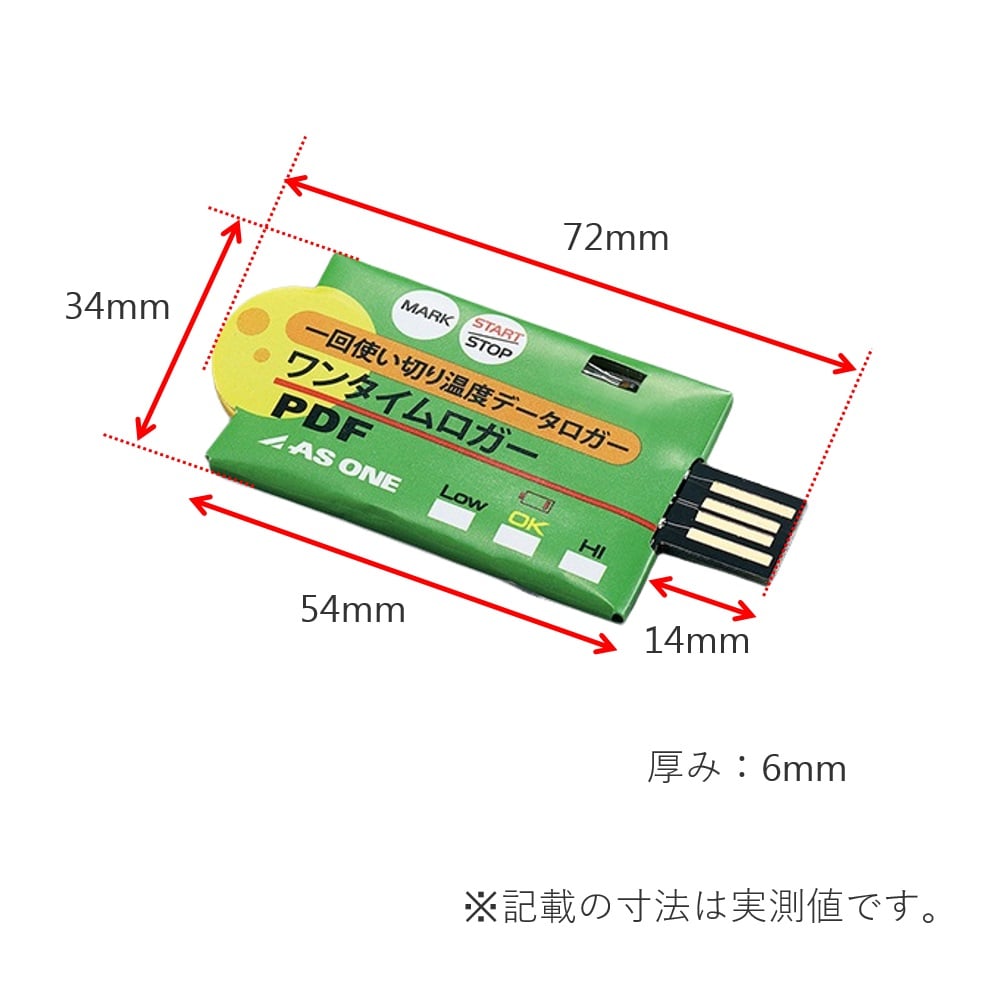 1回使い切りで自動でPDF形式のレポートを作成するため、データの改ざんを防止できます。 設定温度範囲を超えた場合、LEDライトでお知らせします。 自動でPDF形式のレポートを作成するため、特別なソフトウェアは必要ありません。 スタートディレイ設定により、スタートボタンを押してから測定開始までの時間を設定可能です。 パソコンのUSBポートに接続し、初期設定や測定結果のダウンロードが可能です。入数:1個 測定範囲(℃):-30~+70 分解能:0.1℃ 精度:±0.5℃ 記録可能データ数:8192 使用可能環境:-30~70℃、80%RH以下 内蔵電池:3V CR2032(交換不可) 温度測定間隔:0.5、5、10、30、60、90、120分 スタートディレイ設定時間:0、5、30、45、60、90、120分 アラームディレイ設定:0、5、30、45、60、90、120分 防塵・防水保護等級:IP65(袋に入れた状態) 対応OS:Windows(R)7、8、10 付属品:収納用チャック付きポリ袋 ※スタートディレイとは記録スタートボタンを押した後、記録開始を〇〇分遅らせて開始する機能です。 ※アラームディレイとはアラーム温度に達してから〇〇分間の平均温度がアラーム温度を超えた場合にアラームが光ります。(一瞬温度を超えてもアラームと感知しないということです) RoHS2 (EU)2015/863 対応 [RoHSについて]