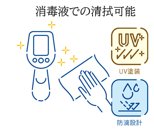 防滴仕様(防滴IPX2)で、本体表面部のアルコール清拭が可能です(防水ではありませんので、本体に液体がかかることは避けてください)。