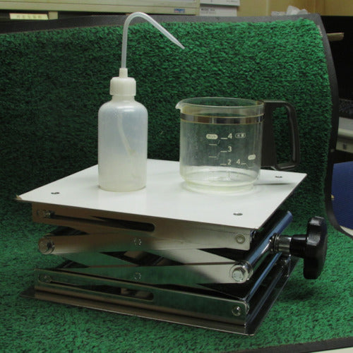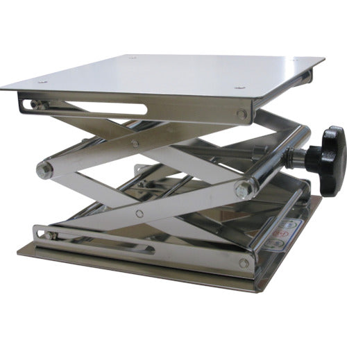 カタログ品番:LJ300 特長:●重量物の高さ移動に使用します。●ノブを回転させれば、スムーズに平行上下移動ができます。 用途:●実験機材の高さ調節。 仕様:●均等荷重(kg):45●間口(mm):300●奥行(mm):300●高さ(mm):88〜490●天板サイズ(mm):300×300●ノブハンドル式 材質/仕上:●上下板:ステンレス(SUS304)●上下板以外:スチール