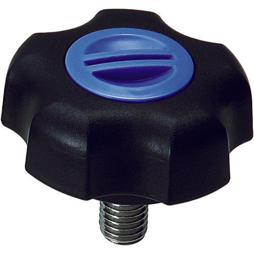 カタログ品番:FIT-K-M6-B-5P 特長:●コインなどで回すだけの簡単着脱です。●豊富なカラーバリエーションです。 仕様:●外径(mm):36●ノブ高さ(mm):20●ねじ寸法:M6×1.0●ねじ深さ(mm):15●キャップ色:青●耐熱温度(℃):80℃ 材質/仕上:●ノブ:ASA樹脂●キャップ:ポリプロピレン(PP)