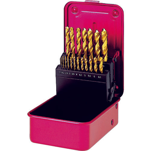 カタログ品番:GSDSET19 特長:●ノンコーティングと比較し、2〜3倍程の長寿命を実現するドリルセットです。 用途:●被削材:一般鋼、ステンレス鋼、鋳鉄、非鉄金属。 仕様:●セット内容(mm):1.0、1.5、2.0、2.5、3.0、3.5、4.0、4.5、5.0、5.5、6.0、6.5、7.0、7.5、8.0、8.5、9.0、9.5、10.0/(0.5とび)●セット入数(本):19●表面処理:TiNコーティング●コーティングドリルセット 材質/仕上:●高速度鋼(HSS)