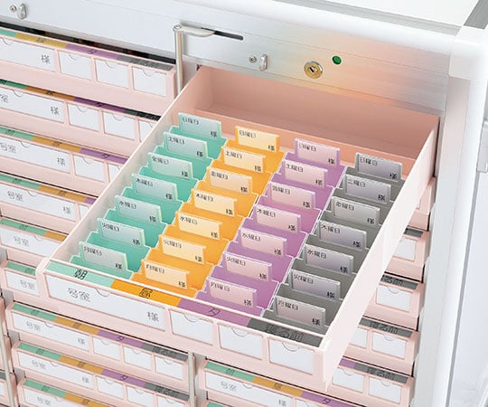 お一人・1引出しで、約1週間分の定時薬を朝・昼・夕・寝る前と分けて管理できます。 与薬トレーは抜け落ち防止のストッパーと、7日分(28ケース)と8日分(32ケース)の両方に対応する仕切りが付いています。 落とし込み天板により物が落ちにくく、使い勝手の良い天板高さです。 カバー付き名札は、患者名・病室名をしっかり表示できます。 与薬トレーの列毎にストップバーが付いていますので、オールロックのシリンダー錠の他に、別売の封印具(7-7772-01・7-7773-01)を使用することで列毎のセキュリティ管理ができます。 側面に別売のマルチホルダー(マグネットタイプ)(7-7770-02等)やマグネットが取付け可能です。サイズ(mm):1220×534×1090 材質 フレーム:アルミニウム 背板:アルミニウム(ポリエステル樹脂塗装) 側板:スチール(ポリエステル樹脂塗装) 与薬トレー・個人ケース:ABS(持続性帯電防止) 与薬トレー:7日分(28ケース)と8日分(32ケース)に対応可 個人ケース内寸法:約(幅)70×(奥行)34×(深さ)31mm キャスター:Φ125mm 付属品:与薬トレー×27床・8日分(1日4回・個人ケース864個入)