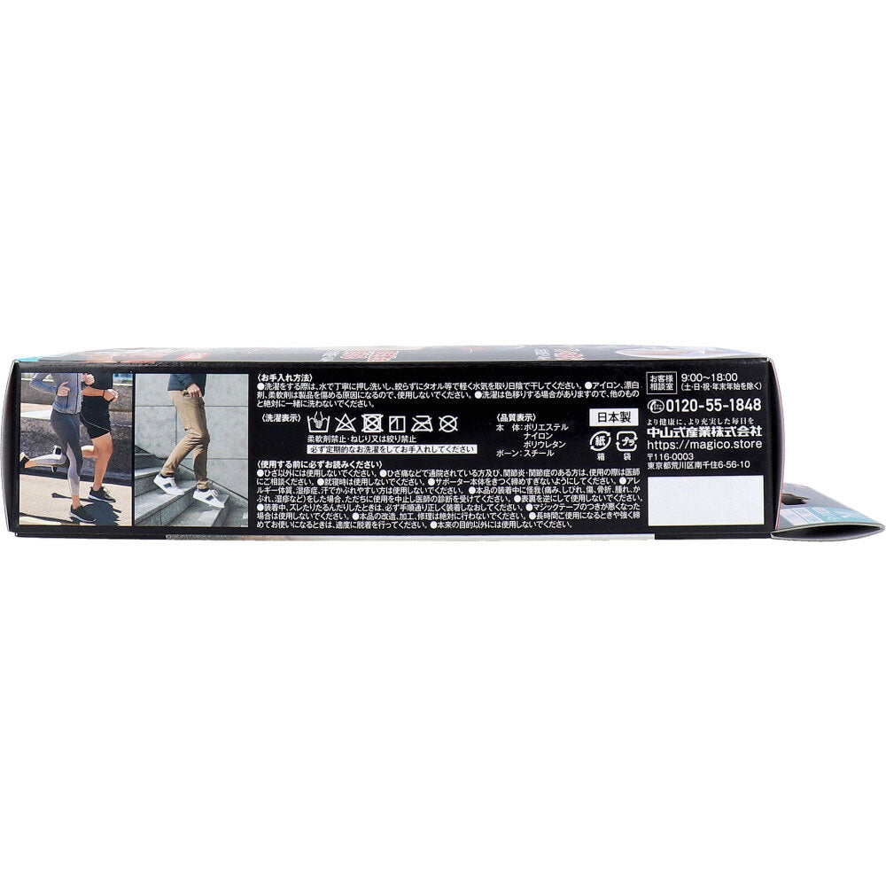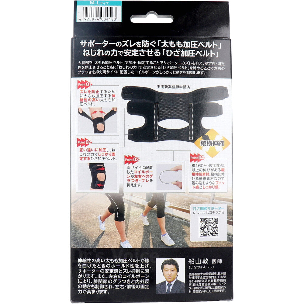 伸縮性の高い太もも加圧ベルトが膝を曲げたときのホールド性を上げ、サポーターの安定感とズレ抑制に繋がります。また、左右のコイルボーンにより、膝関節のグラつきと内外反の動きも制御され、左右・前後の固定力が高まります。 【品質表示】