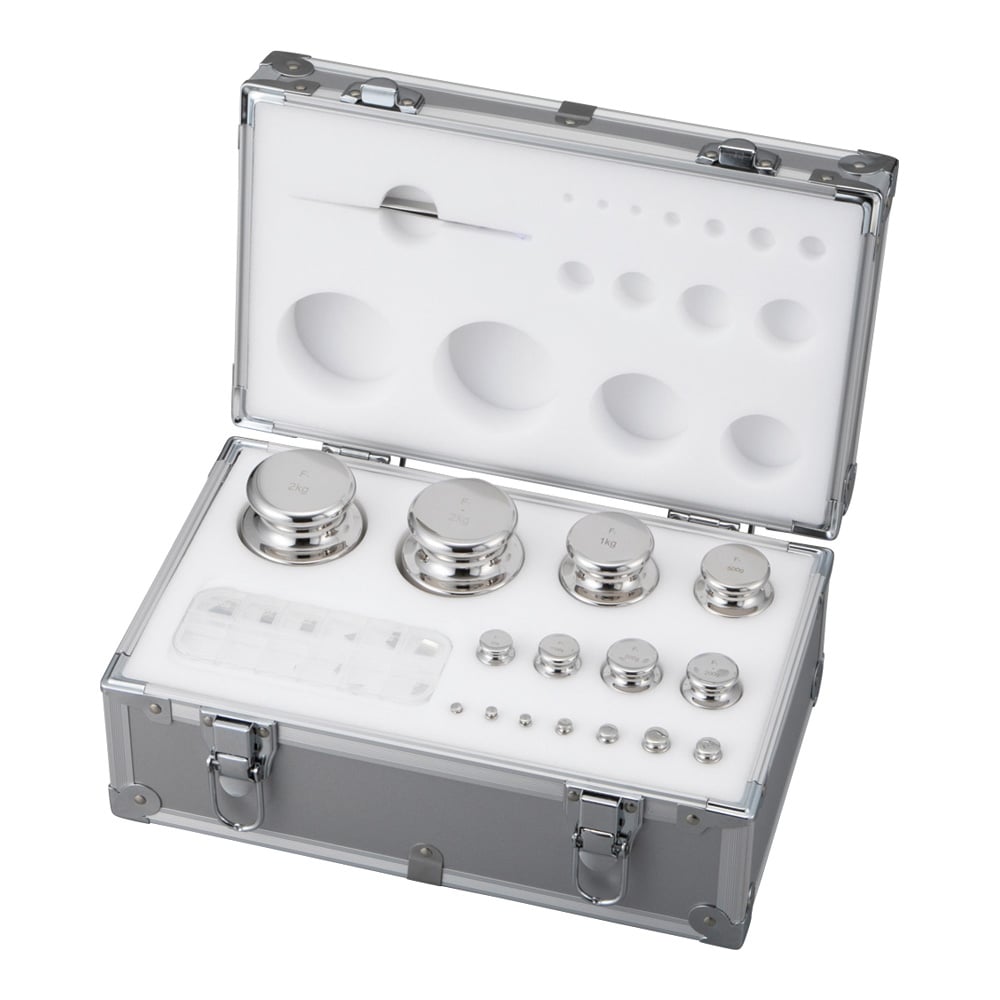 セット内容:1mg×1個、2mg×2個、5mg×1個、10mg×1個、20mg×2個、50mg×1個、100mg×1個、200mg×2個、500mg×1個、1g×1個、2g×2個、5g×1個、10g×1個、20g×2個、50g×1個、100g×1個、200g×2個、500g×1個、1kg×1個、2kg×2個、ピンセット×1個、専用アルミケース×1個