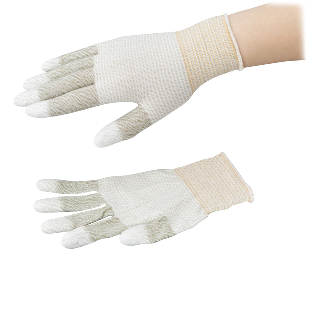 指全体を導電糸(硫化銅複合繊維)のみで編みあげ、作業中の摩擦・接触による帯電を防ぎます。 指先部を発泡ポリウレタンコートしており、高い滑り止め効果を発揮します。 編み目が細かく縫い合わせのない、13ゲージ・シームレス編み低発塵性手袋です。サイズ:S 全長(mm):185 簡易包装 材質:繊維部/ナイロン・ポリエステル、樹脂部/ポリウレタン 表面抵抗値:10^5~10^7Ω 手首ゴム糸色:ゴールド 左右兼用 洗濯可 RoHS2 (EU)2015/863 対応 [RoHSについて]