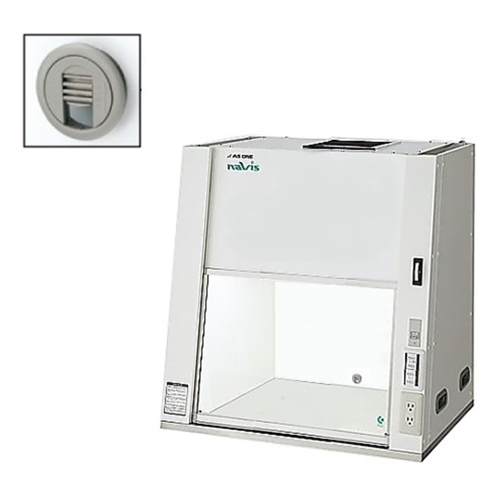 殺菌灯付き! 前面扉が作業しやすい角度に傾斜しています。 前面扉はバランサーにより、任意の位置で高さを保持できます。 照明・ファンスイッチおよびコンセントを前面外部に配置していますので、操作性に優れています。 庫内には輸液バッグなどを吊り下げるハンガーパイプが付いています。 殺菌灯付きですので庫内の殺菌も可能です。 ガスホース導入孔はシャッター付きグロメットになっており、φ41mmまでのガスホースを通すことができます。外寸法(mm):900×600×880 庫内有効寸法(mm)※1:W700×(D450~550)×H535 ※1:庫内有効寸法は一部突起部を除きます。 材質:本体/スチール(焼付塗装)、作業面・ハンガーパイプ/ステンレス(SUS304)、前面扉/透明強化ガラス(厚さ5mm) メインフィルター:抗菌・防臭HEPAフィルター ※集塵効率99.97%以上(0.3μm粒子以上) プレフィルター:不織布フィルター  庫内清浄度:Class 5(クラス100) 電源:AC100V 50/60Hz(3Pプラグ、コード長3m) 照明:LED照明(20W相当) コンセント(2口)付き 差圧計付き 庫内ハンガーパイプ(φ25mm×1本)付き 殺菌灯:15W×1本 作業面寸法:700×550mm 前面扉最大開口寸法:700×430mm 消費電力:113W 重量:66kg ※特注及び追加工可能です。
