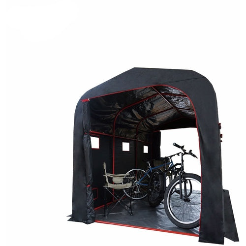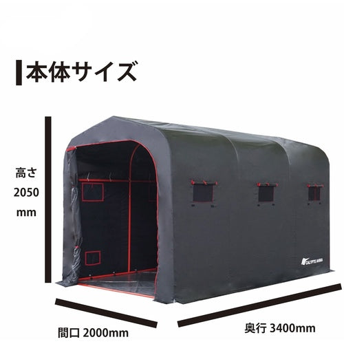 カタログ品番:CALYPTEGARAGE-XL 特長:●簡易的な組立・設置で自転車収納や倉庫として使用できます。●愛車を雨、ホコリからしっかり守ります。●ブラックにレッドのラインで景観を損ないません●自転車の収納はもちろん、バイクやアウトドア用品、庭の道具、除雪機等も収納可能です。前後のどちらからでも出入り可能で、ワンタッチのジップ開閉は日常の使用をとても楽にします。 用途:●自転車・バイクなどの車庫として●多目的用途に利用 仕様:●収容台数(台):3●間口(mm):2000●奥行(mm):3400●高さ(mm):2050●タイプ:XL●色:ブラック●外幕生地:OXFORD 内幕生地:クロス生地 フレーム:鉄 ●収納と組立しやすい構造です。●防水に特化した二重幕です。●褪色の少ない特殊幕です。●通常より太めのパイプを使用、通風口6つ、中型〜大型バイク、トライクが収納可能です。●雨、風、紫外線から大切な愛車や資材を守るガレージです。●外幕から浸水しても庫内を雨から保護するクロス生地内幕と、ガレージ内をカビや湿気から守る通気窓を搭載しています。●骨組みはワンタッチで接合できるため、工具なしで組立可能です。 材質/仕上:●外幕生地:OXFORD 内幕生地:クロス生地 フレーム:鉄 注意:●設置時の注意:■雪がまとまって落ちる場所、雪が吹き溜まりになる場所、焼却炉や火気付近への設置はお止めください。■積雪時は随時除雪を行い、出入りはお止めください。■強風時や強風が予想される時は、全てのシートを外してください。