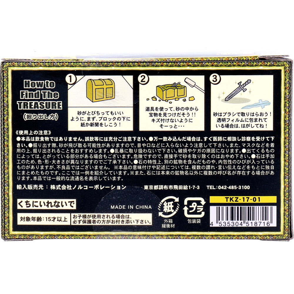 砂の中から伝説の宝物が出てくる! 当たりはな、なんと!数々の伝説を持つダイヤモンドの原石!(本物) ●砂の中から宝物が1コが出てくるよ! ※出てくるのは10種類のうちのどれか一つです。 ・ダイヤモンドの原石 ・カーネリアンの原石 ・タイガーアイの原石 ・アメジストの原石 ・ブラッドストーンの原石 ・クリスタルの原石 ・ナポレオン1世の王冠 ・関羽の武器(青龍偃月刀) ・アーサー王の剣 ・ツタンカーメンの黄金のマスク 【堀り出し方】 (1)砂がとびちってもいいように、まず、ブロックの下に紙か新聞をしこう! (2)道具を使って、砂の中から宝物を見つけだそう!! キズ付けないようにそーっと・・・ (3)砂はブラシで取りはらおう! 透明フィルムに包まれている場合は、はがしてね! 【使用上の注意】 ・本品は飲食物ではありません。誤飲等に充分ご注意下さい。 ・万一飲み込んだ場合は、すぐ医師に相談し診察を受けて下さい。 ・掘り出す際、砂が飛び散る可能性がありますので、目や口などに入らないよう注意して下さい。また、マスクなどを着用の上、掘り出されることをおすすめします。 ・乱暴に取り扱わないでください。破損やケガの原因になります。 ・出てくるものによっては、とがっている部分がある場合もございます。危険ですので、直接手で砂を取り除くのはおやめ下さい。 ・石は手加工のため、色・形・大きさが異なりますのでご了承下さい。 ・石の特性上、別の鉱物を含んだものや、内包性のひびが入っているものがありますが、不良品ではございません。 ※本品の意味付けについては、複数の謂れ言い伝えなどをもとに独自にまとめたものです。ここでは一例を紹介しています。 ※また、石には本来の鉱物名以外に複数の呼び名が存在する場合があります。本品では一般的な流通名を表示しています。 ※くちにいれないで ※お子様が使用される場合は必ず保護者の方がお付き添い下さい。