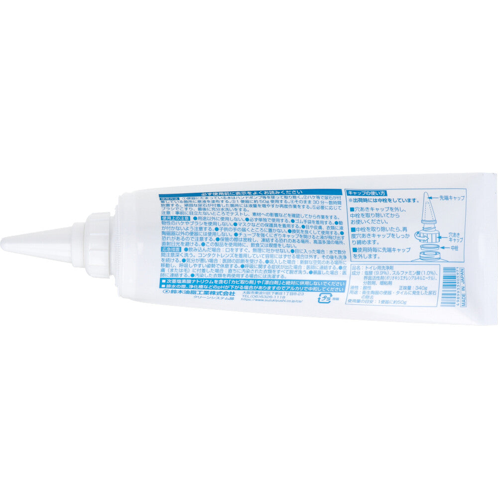 一般便器のフチ裏や小便器のリムなどの垂直面に発生した尿石に便利! どろっとしたジェルがたれにくく効果発揮! 【品名】 トイレ用洗浄剤 【成分】 塩酸(9.9%)、スルファミン酸(1.0%)、界面活性剤(ポリオキシエチレンアルキルエーテル)、分散剤、増粘剤 【液性】 酸性 【用途】 衛生陶器の便器、タイルに発生した尿石の除去 【使用量の目安】 1便器に約50g 【使用方法】 (1)便器にたまっている水はハンドポンプ等を使って取り除く。 (2)ハケ等で尿石が付着している箇所に原液を塗布する。 (3)1便器に約50gを使用する。 (4)そのまま30分~数時間放置する。頑固な尿石が付着した箇所には液量を増やすか再度作業する。 (5)必要に応じてブラシでこすり、最後に充分水洗いする。 ※事前に目立たないところでテストし、素材への影響などを確認してから作業をする。 【使用上の注意】 ※冷暗所保管、高温、直射日光厳禁、車中放置厳禁 ※塩素系の製品と一緒に使う(まぜる)と有害な塩素ガスが出て危険です。 ※必ず換気をよくして使用してください。 ※次亜塩素酸ナトリウムを含む「カビ取り剤」や「漂白剤」と絶対併用しないでください。 ※排水の際、浄化槽などのpHが下がる場合がありますのでアルカリで中和してください。 ・用途以外に使用しない。 ・必ず単独で使用する。 ・ゴム手袋を着用する。 ・動物性のハケやブラシを使用しない。 ・マスクなどの保護具を着用する。 ・目や皮膚、衣類に液が付かないよう注意する。 ・子供の手の届くところに置かない。 ・換気をよくして使用する。 ・陶磁器以外の便器には使用しない。 ・チューブを強くにぎりキャップを開けると液が飛び出す恐れがあるので注意する。 ・保管の際は密栓し、凍結する恐れのある場所、高温多湿の場所、直射日光を避ける。 ・この本製品を使用時に、飲食又は喫煙をしない。 ★危険有害性情報 ・金属腐食のおそれ ・重篤な皮膚の薬傷及び眼の損傷 ・飲み込むと有害 ・吸引すると有害 ・吸引するとアレルギー、ぜん息又は呼吸困難を起こすおそれ ・臓器の障害(呼吸器系) ・長期にわたる、又は反復ばく露による臓器の障害(呼吸器系、歯) ・水生生物に毒性 【応急措置】 ・飲み込んだ場合:口をすすぐ。無理に吐かせない。 ・眼に入った場合:水で数分間注意深く洗う。コンタクトレンズを着用していて容易にはずせる場合は外す。その後も洗浄を続ける。 ・気分が悪い場合:医師の診断を受ける。 ・吸入した場合:新鮮な空気のある場所に移動し呼吸しやすい姿勢で休息する。 ・呼吸に関する症状が出た場合:医師に連絡する。 ・皮膚(または毛)に付着した場合:直ちに汚染された衣類をすべて脱ぎ洗う。 ・暴露した場合:医師に連絡する。 ・汚染した衣類は再使用する場合には洗濯する。