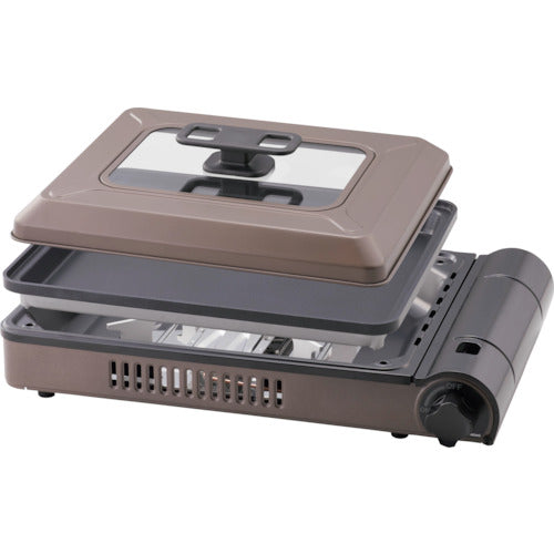 カタログ品番:CB-GHP-B 特長:●カセットボンベが燃料のガス式ホットプレートです。●電気を使わないコードレスなので使う場所を選びません。●一台で焼く、蒸す、鍋の調理ができます。●直火式2.1kWの強い加熱能力です。●火加減調整がクイックレスポンスで美味しく調理します。●調理高さ5cmの深型プレートカバーで厚みのある食材も調理できます。●ごとく付でカセットコンロとしても使えます。 仕様:●奥行(mm):334●高さ(mm):169●色:ブラウン●電源:カセットガス●電源(V):カセットガス●幅(mm):471●最大火力(kW):2.1●連続燃焼時間:約120分●プレートサイズ:342×268×22mm(内寸) 材質/仕上:●本体、しる受け:鋼板●プレート:アルミダイカスト(フッ素コート)●蓋:鋼板、ガラス、フェノール樹脂●ごとく:耐熱アルミダイカスト