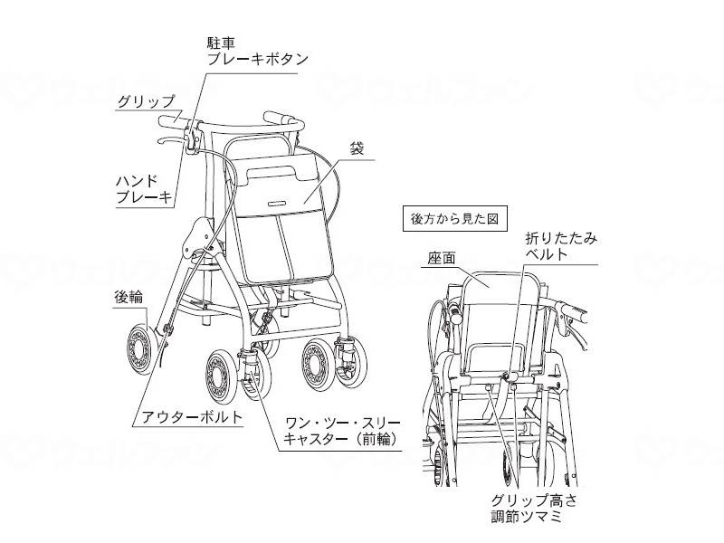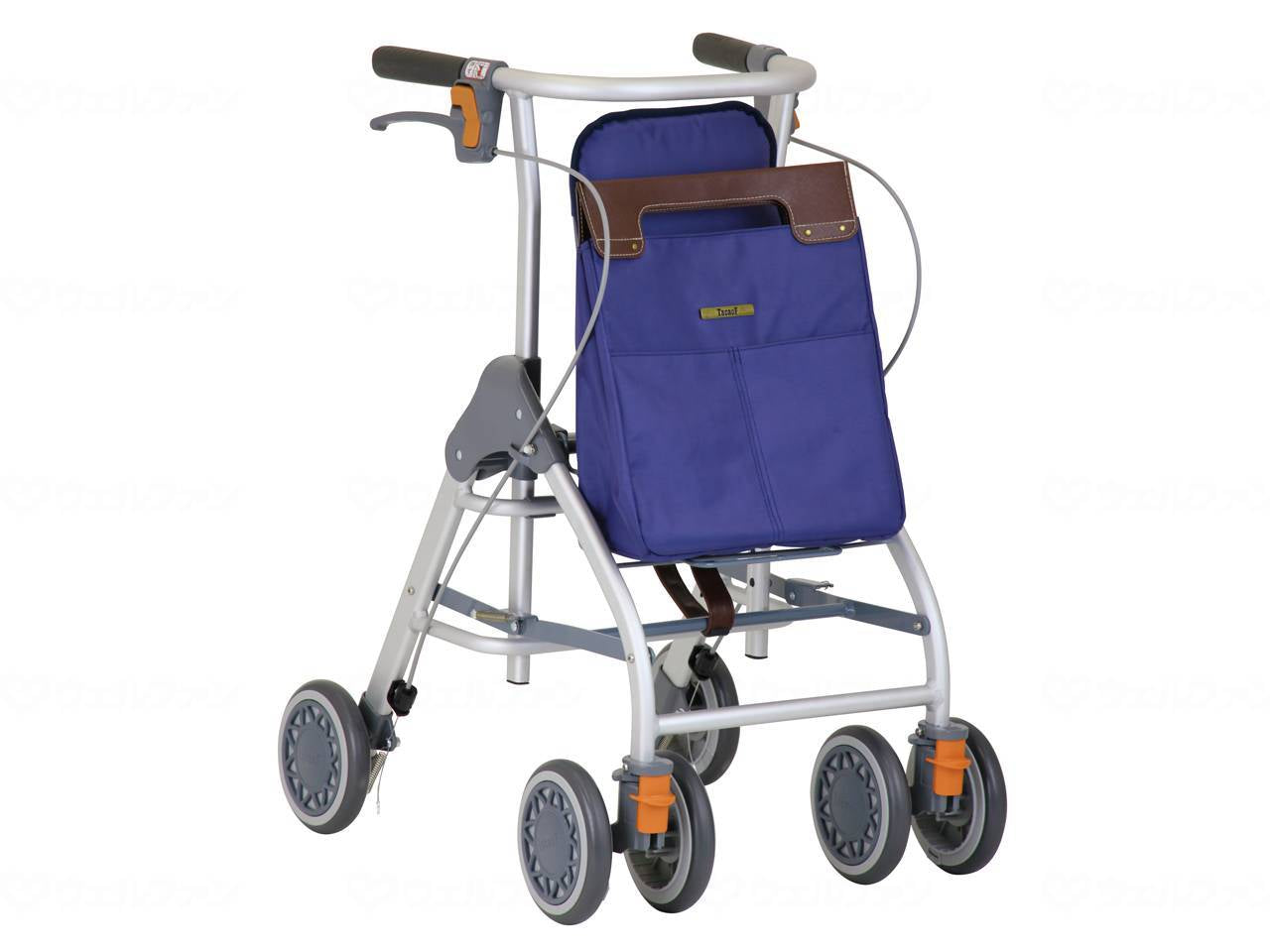 メーカー品番:「WAW04」 TAIS:「00030-000163」 コメント 小回りが利き、楽に使える!軽さが魅力のスリム設計。 コンパクト&簡単操作 本体幅47cmでコンパクト 小回りが利くので、狭い曲がり角や室内でも楽にお使いいただけます。 軽くて持ち運びに便利! 本体重量は約4.5kgと軽いので、段差での持ち上げや車への積み下ろしの際の負担も軽減。 幅広い高さ調節 押し手高さが幅広く調節できるので、背の高い方から低い方まで負担なくお使いいただけます。 折り畳み寸法:幅470×奥行350×高さ720mm 押し手高さ:640~910mm(10段階) 座面寸法:幅235×奥行250mm 座面高さ:480mm 袋寸法:幅300×奥行120×高さ340mm 車輪寸法:前輪/150Φ、後輪/150Φ 最大使用者体重:75kg 最大積載荷重:4kg 細い道や曲がり角などでもスイスイ移動できる快適な使い心地の歩行車です。 ■搭載機能 ピッチ押し手高さ調節(ワンタッチ) ボタン式手元ストッパー 1・2・3キャスター 折り畳み式 反射機能 本体の旋回性が高いので快適に扱える 車体の回転半径が66cmと小さく、小さい範囲で方向転換でき、小回りが利きます。 ※杖立てはオプションで取り付けいただけます。 アルミアルマイト仕上げ 材質・原材料 <材質> 本体/アルミ 座面/ナイロン 袋/ナイロン・ポリエステル 規格詳細 組立寸法:幅470×奥行580×高さ640~910mm 重量:約4.5kg